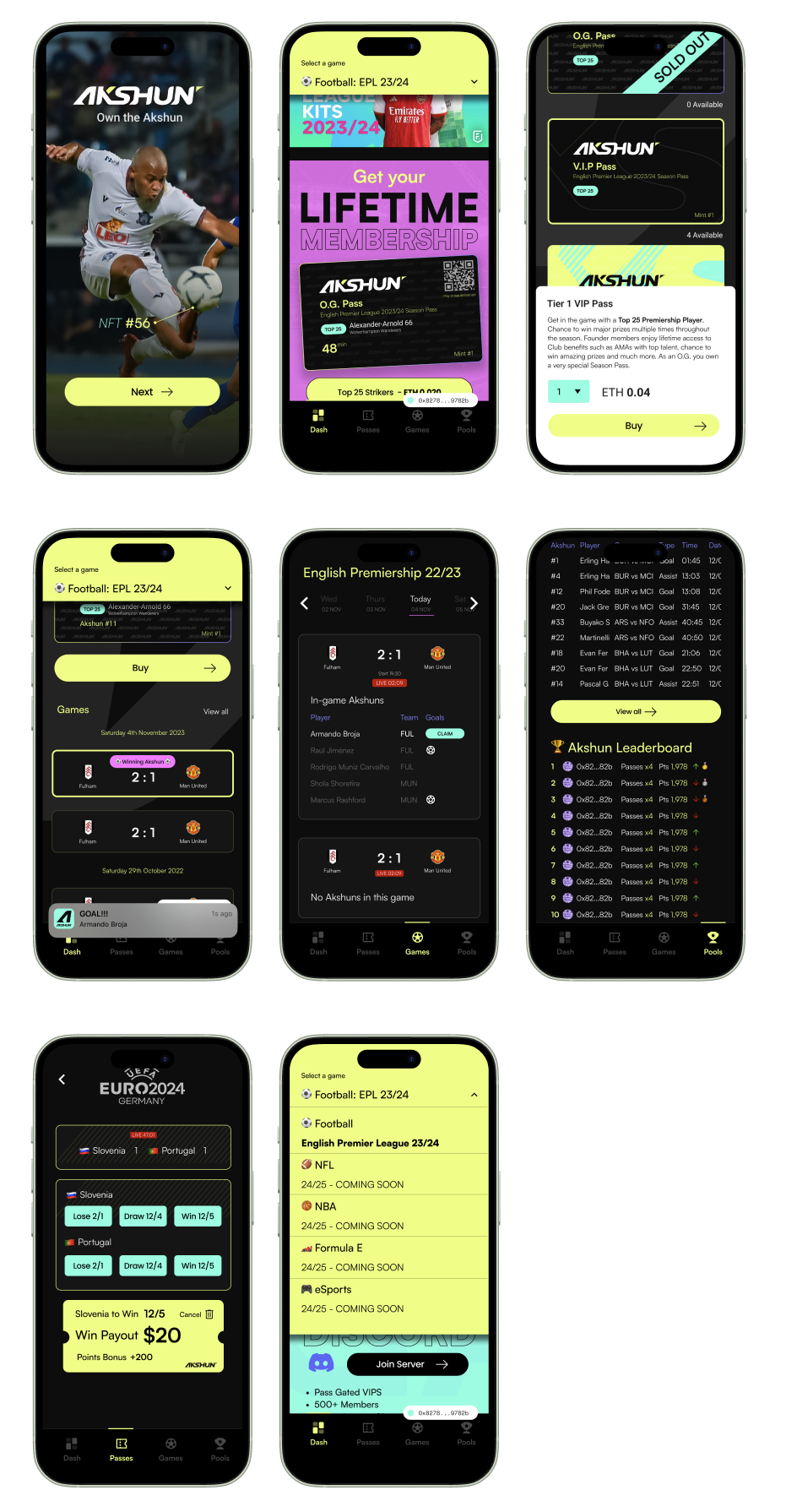 I led the entire UX and product design process from early concept through to MVP. Starting with user interviews and competitor analysis, I mapped the complete experience: how a fan discovers Akshun, connects a wallet, mints a Season Pass, reveals their player, joins games, and tracks rewards in real time.